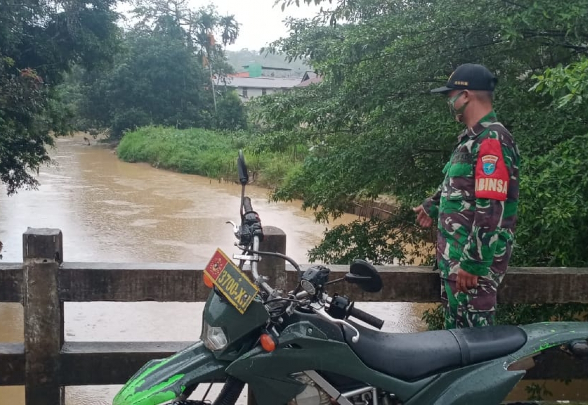Seperti yang dilakukan Serda Antonius, Babinsa Desa Darit, yang memantau debet air sungai dari atas jembatan desa setempat, Minggu (6/6/2021).