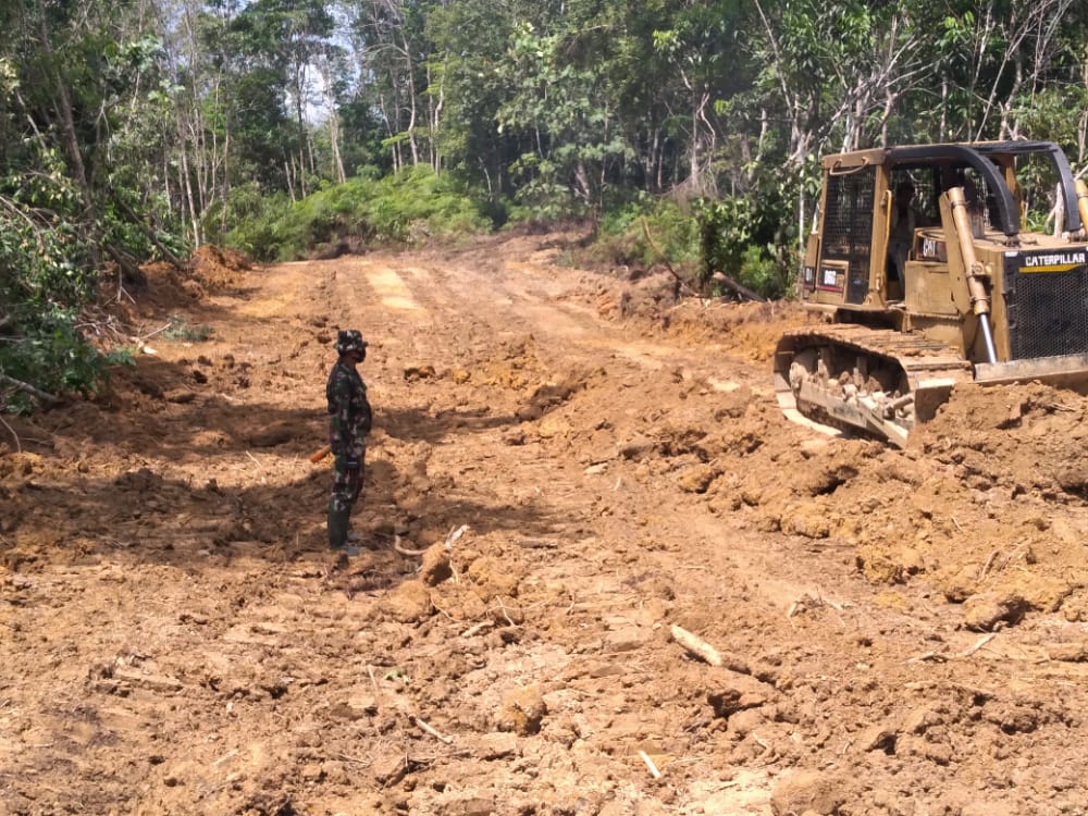 BARITO UTARA - Anggota Satgas Tentara Manunggal Masuk Desa (TMMD) yang melakukan pengawasan proses pembukaan jalan baru, bekerja keras dengan menggunakan alat berat, di wilayah Desa Karamuan Kecamatan Lahei Barat Kabupaten Barito Utara, Pada hari Rabu (09/06/21)