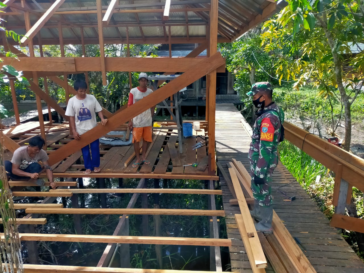 MURUNG RAYA - Berperan aktif dalam setiap kegiatan masyarakat di desa binaan, Babinsa Koramil 1013-11/Sumber barito, Koramil 1013-11/Sumber barito Sertu Antonius, bersama warga kerja bakti bantu renovasi rumah warga yang tidak layak huni di Desa kalapeh baru, Kecamatan Sumber barito, Kab.Murung raya, Senin (07/06/2021).