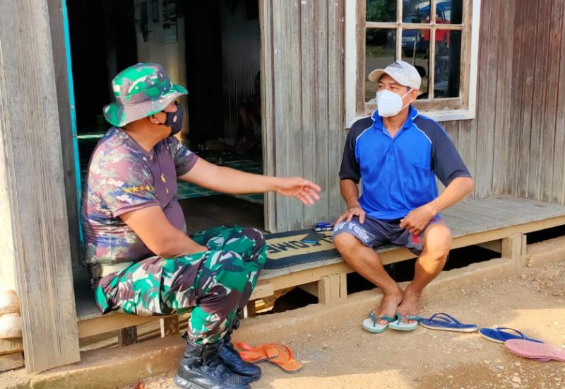 Barito Utara - Disela-sela waktu istirahat, personil satgas TMMD ke-111 Kodim 1013/Mtw manfaatkan waktu untuk komsos bersama warga Desa Karamuan Kecamatan Lahei Barat Kabupaten Barito Utara, pada hari Rabu (9/06/21).