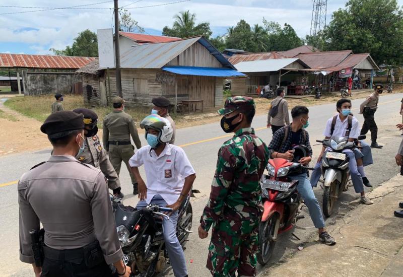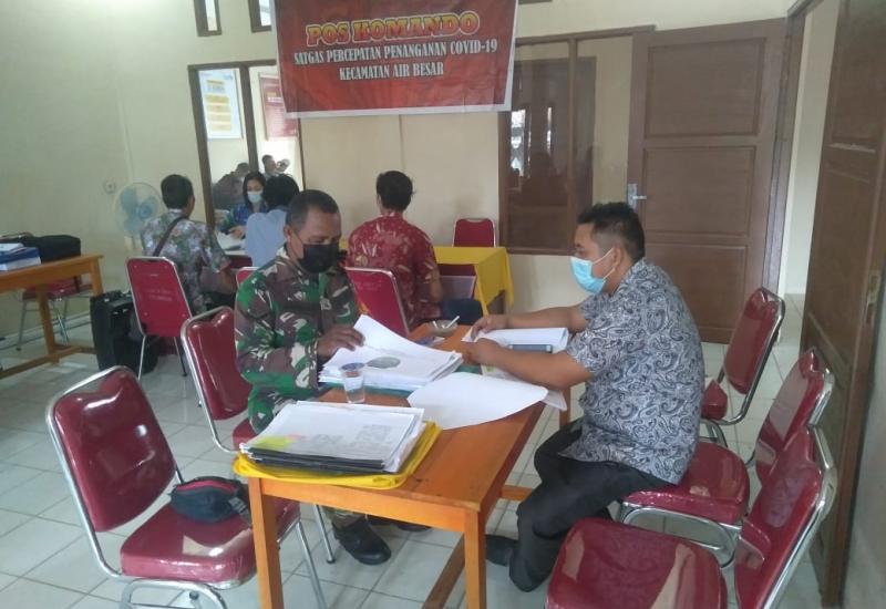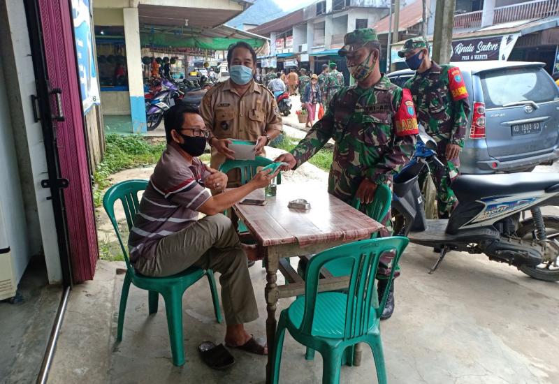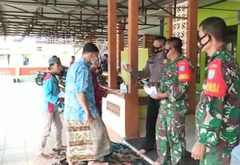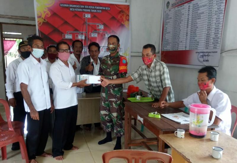 Landak - Koptu Suhud Babinsa Koramil 1201-09/Sengah Temila membagikan masker kepada Perangkat Desa Keranji Paidang dan warga yang datang berurusan ke kantor desa, Sabtu (12/6/2021).