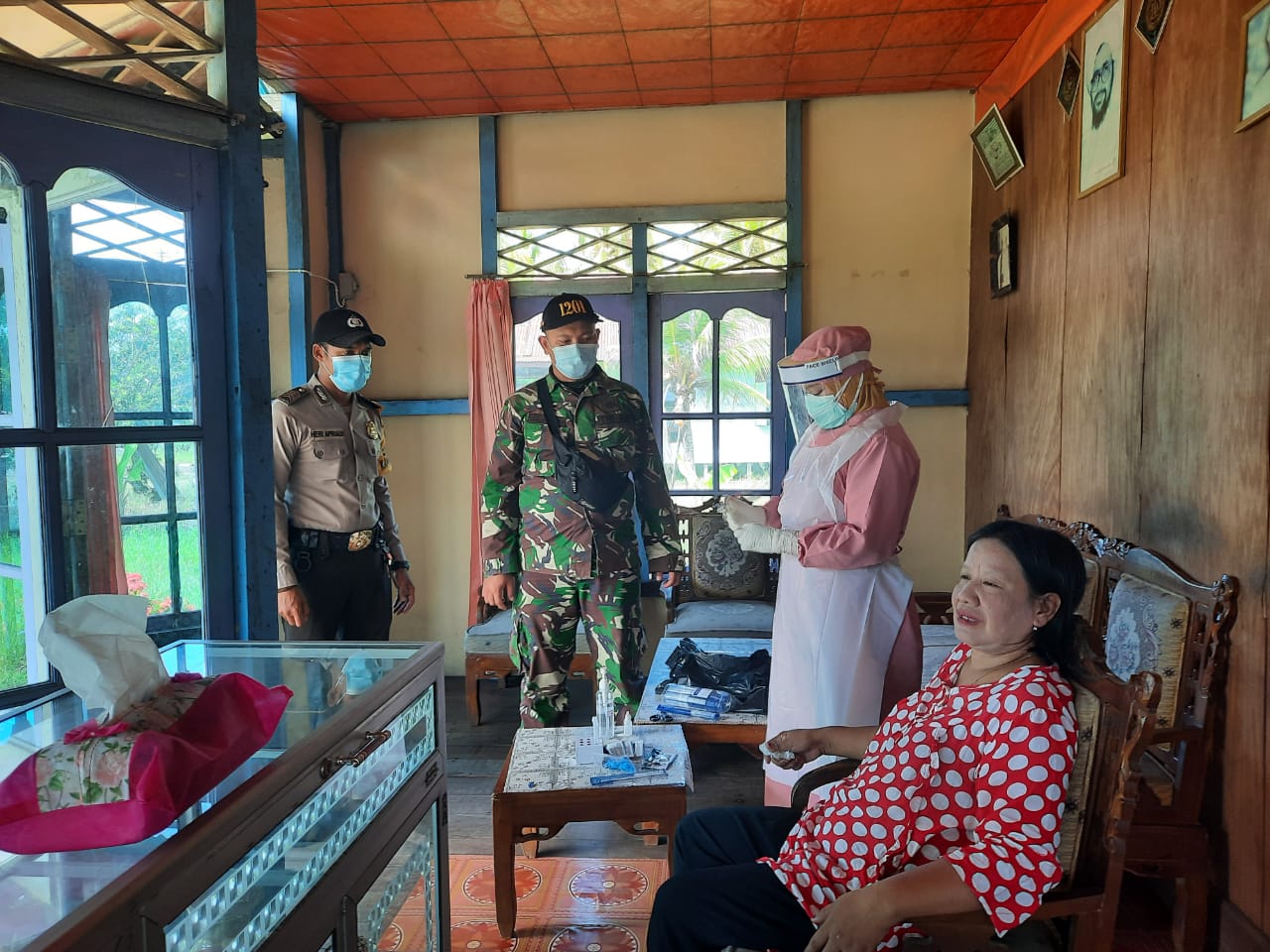 Mempawah – Anggota Koramil 1201-04/Sungai Kunyit, Serda Juliansyah mendampingi petugas kesehatan Puskesmas Sungai Kunyit melaksanakan tesswab PCR terhadap warga Desa Sungai Limau, Kecamatan Sungai Kunyit, Kabupaten Mempawah, Senin (14/6/2021).