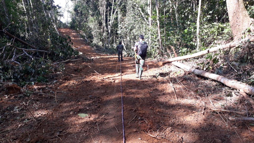 Barito Utara - Anggota Satgas TMMD ke-111 Kodim 1013/Mtw mengukur seberapa jauh sudah pembukaan jalan yang telah dikerjakan oleh anggota satgas TMMD Kodim 1013/Mtw, Kamis (10/06/21).